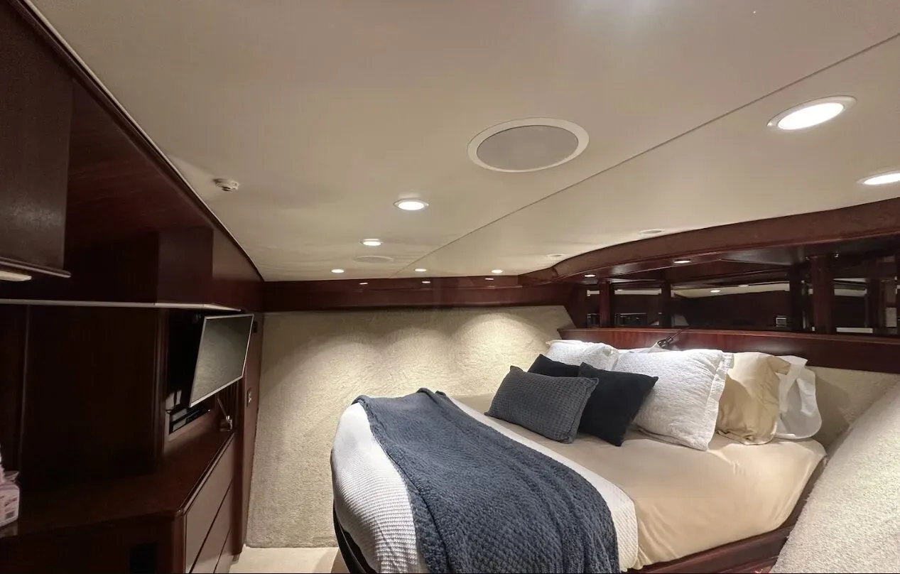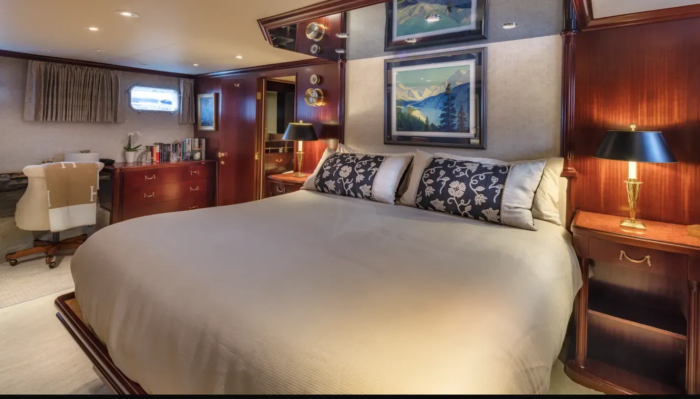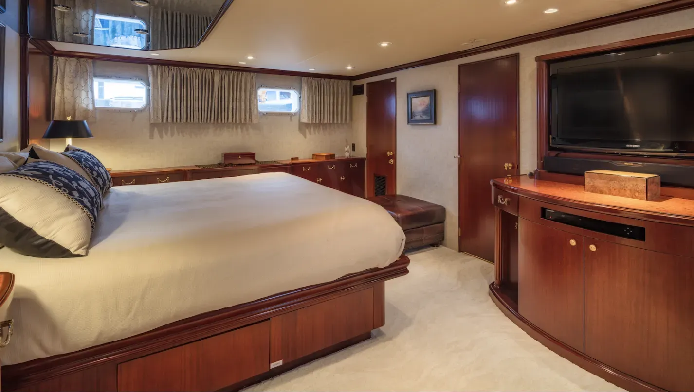 - The Master stateroom with King Bed spans the full width of the yacht.