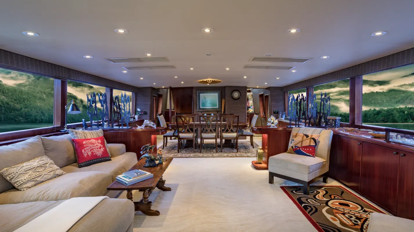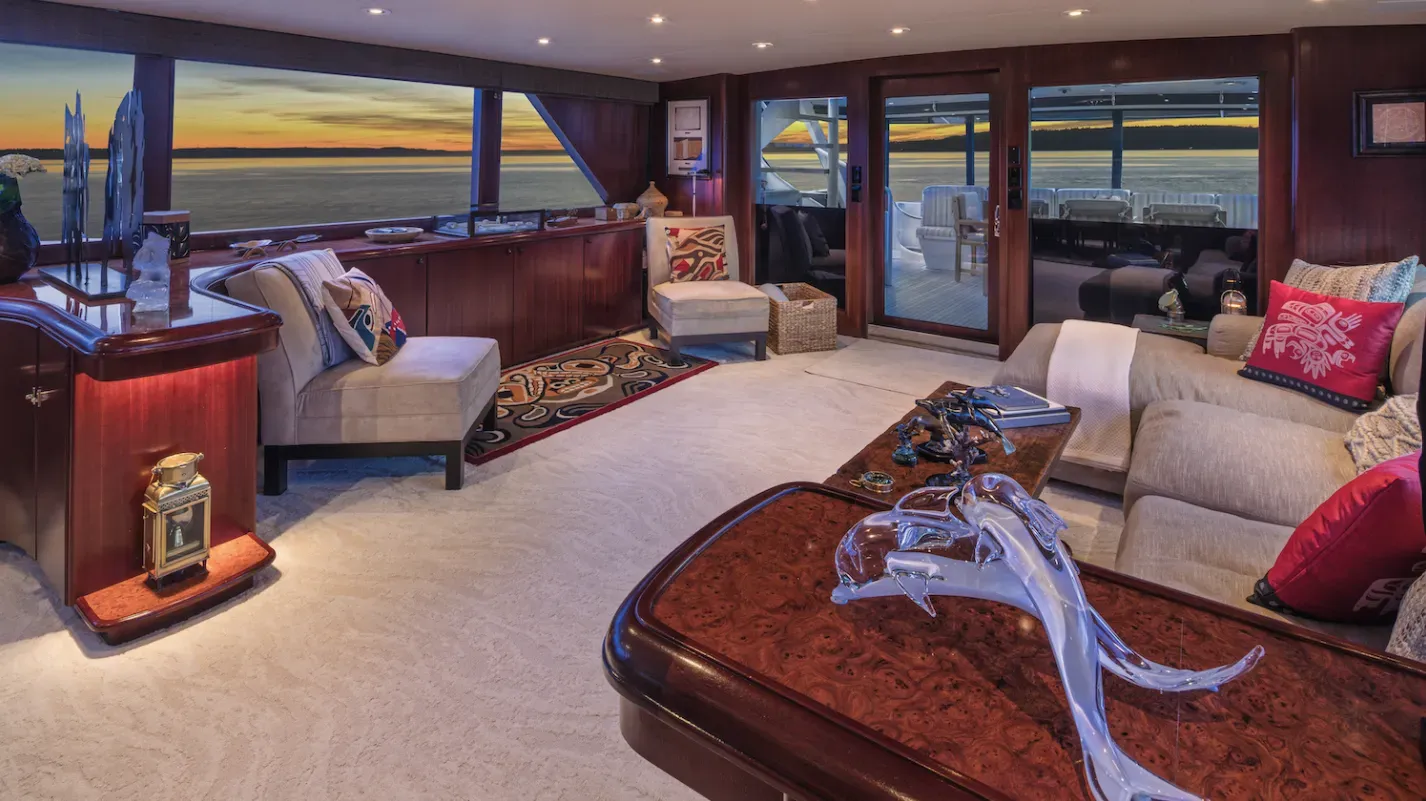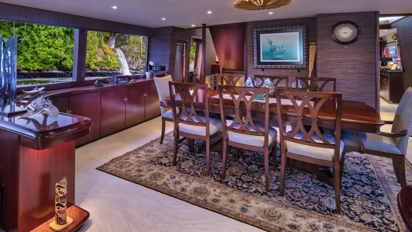 M/Y BLACKWOOD is a 31m (103’) luxury yacht that blends classic elegance with modern comfort, following a full refit in 2025. She accommodates up to 8 guests in 4 well-appointed ensuite cabins—Master, VIP, Queen, and Twin—and is cared for by a professional crew of four. Thoughtfully designed for Alaskan cruising, BLACKWOOD features an enclosed aft deck for all-weather dining, a cozy flybridge with lounge seating, fireplace, and Bluetooth sound system, and a warm saloon decorated with Alaskan artifacts and indigenous art. Modern amenities include air conditioning and heating throughout, Starlink Wi-Fi, and stabilizers for a smooth, comfortable ride.