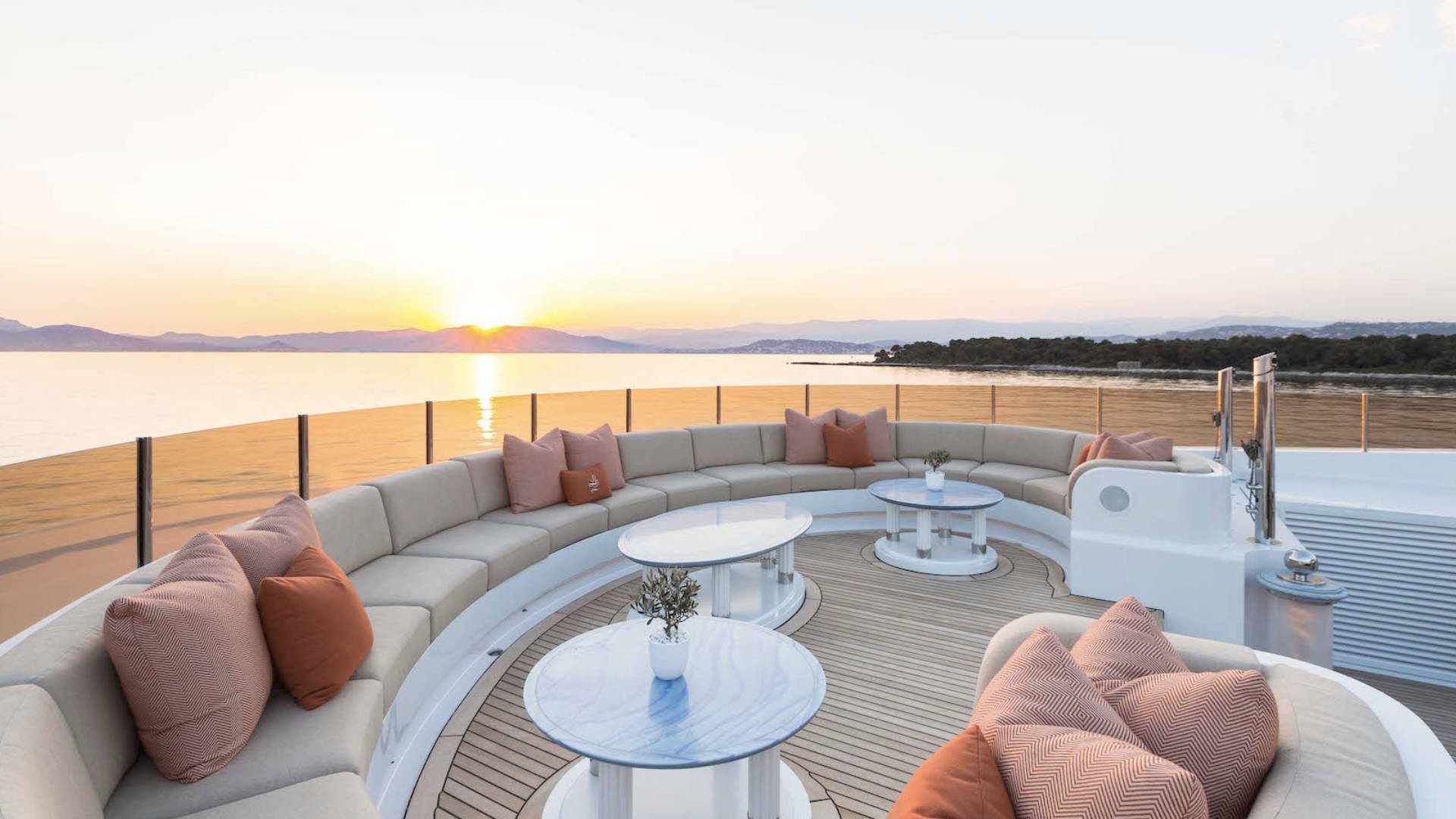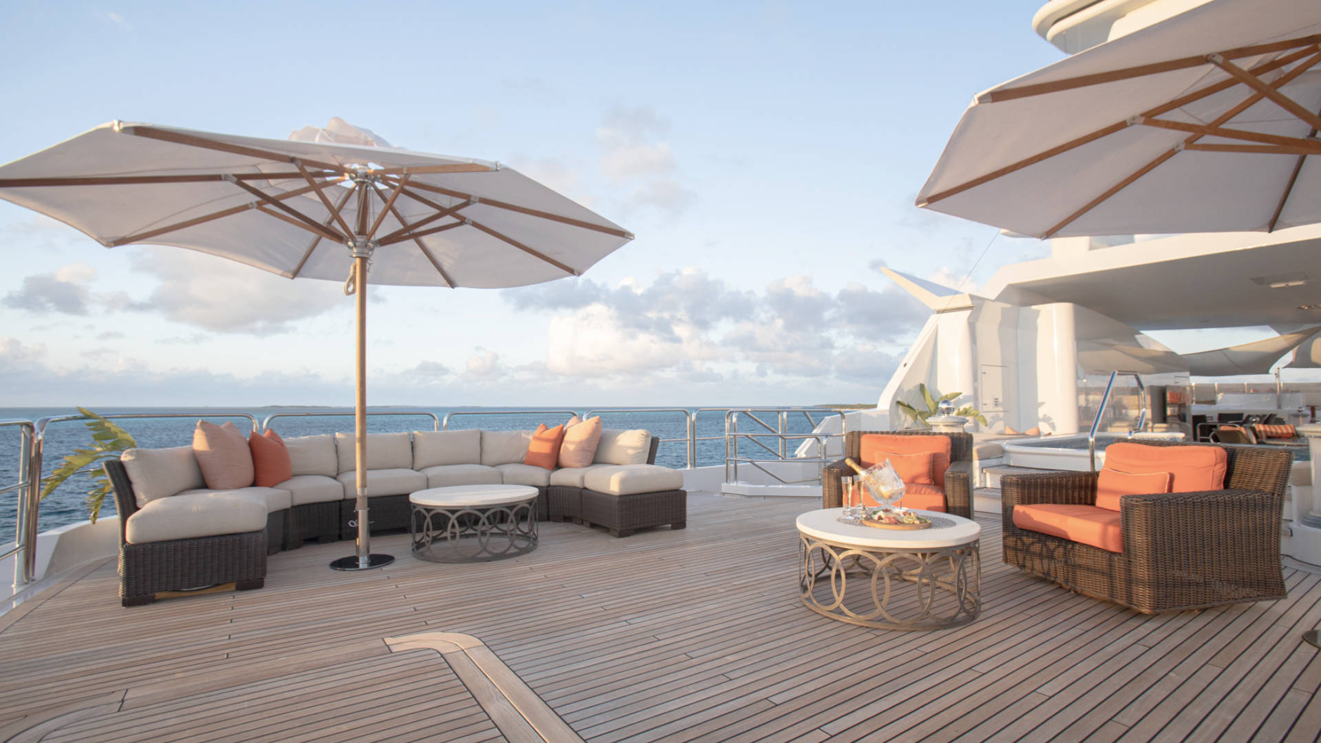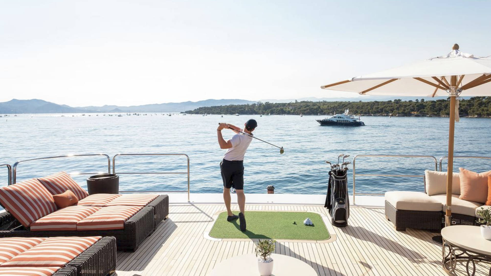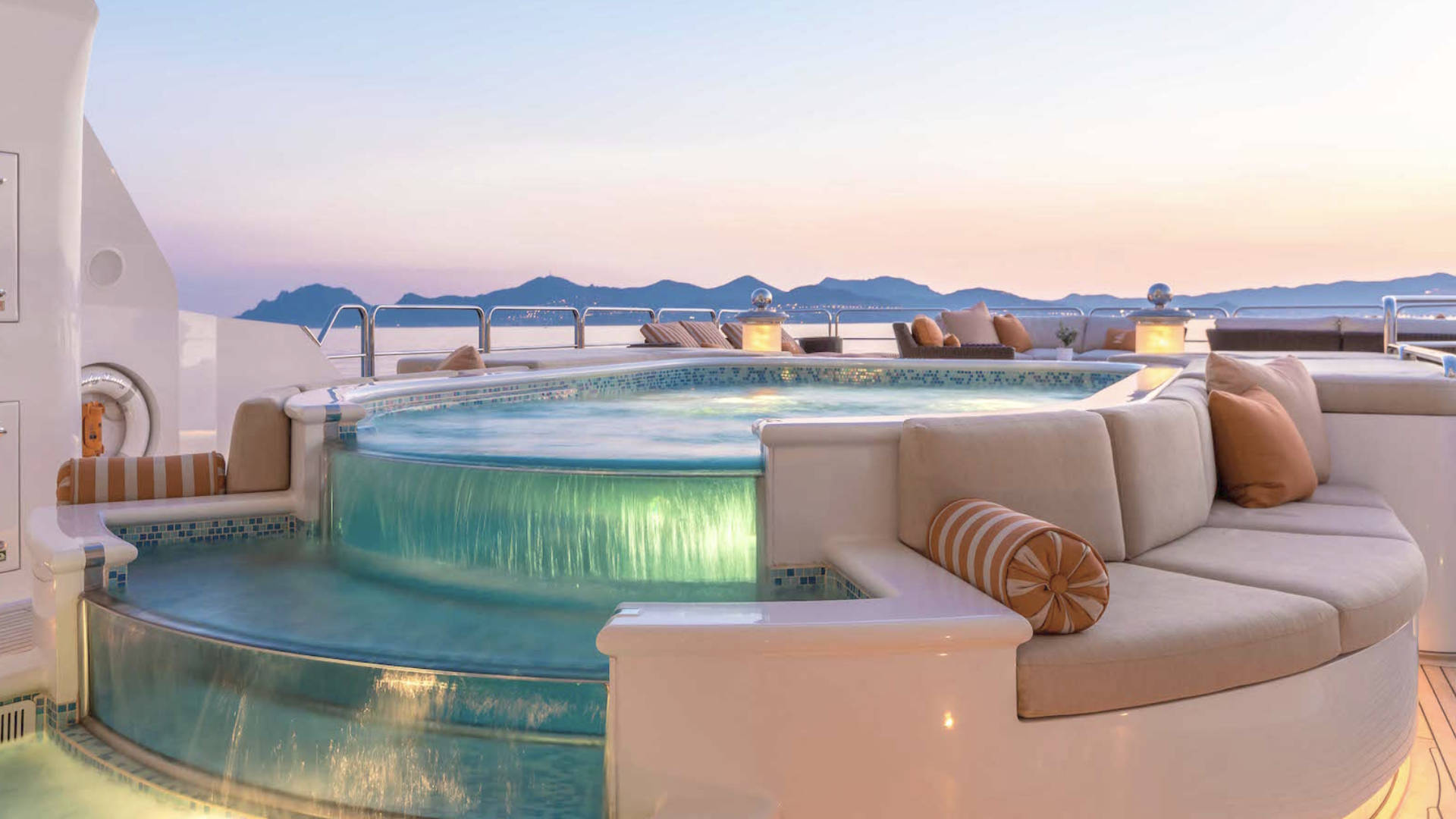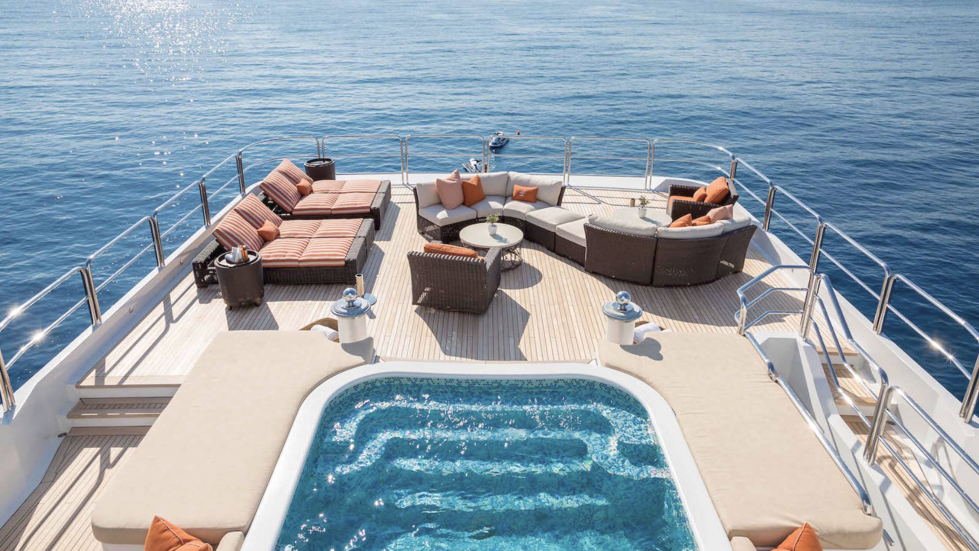 The top deck with 360 degree view is a heavenly place with a plunge pool with two level waterfall, a small paddling pool ideal for children and large sun pads. An aft area can be either a seating area or a golf tee!