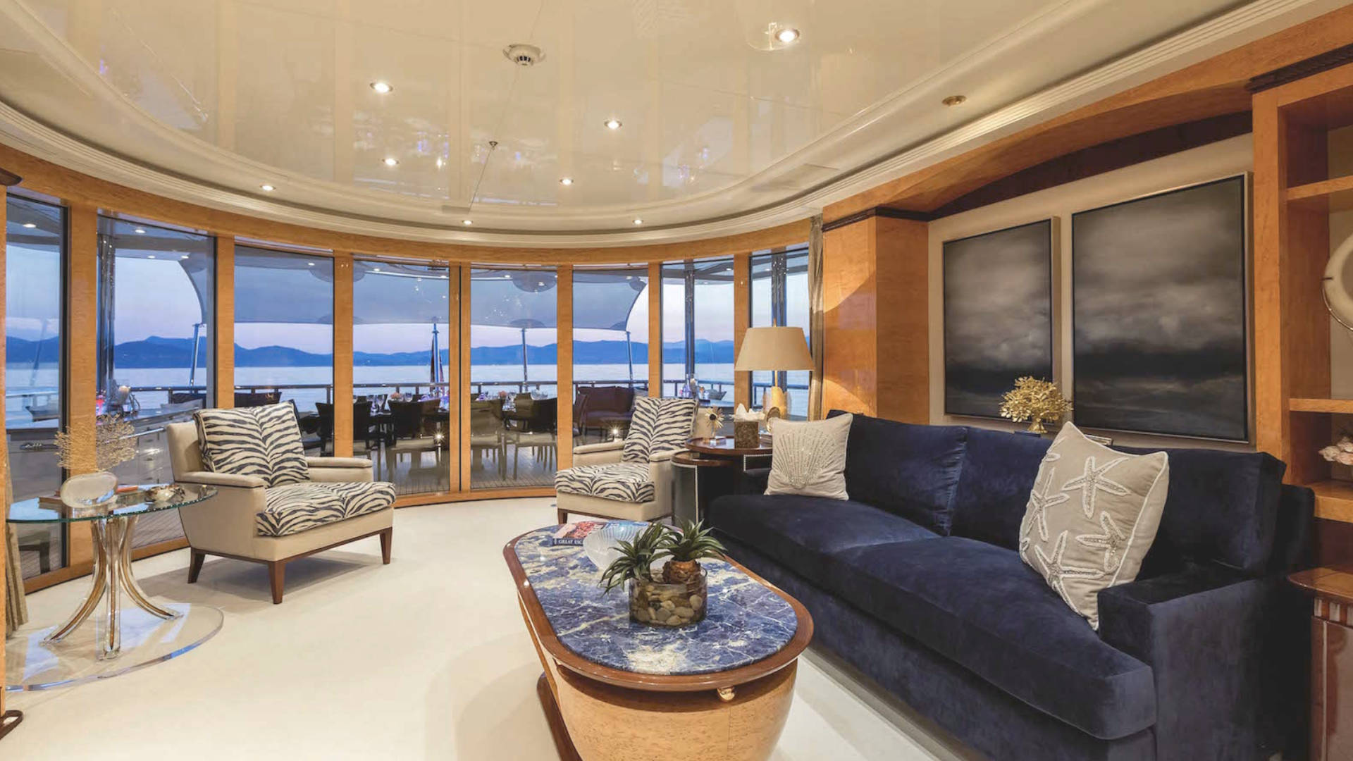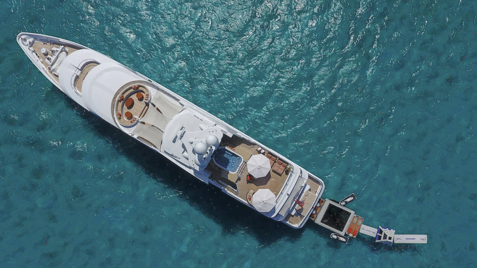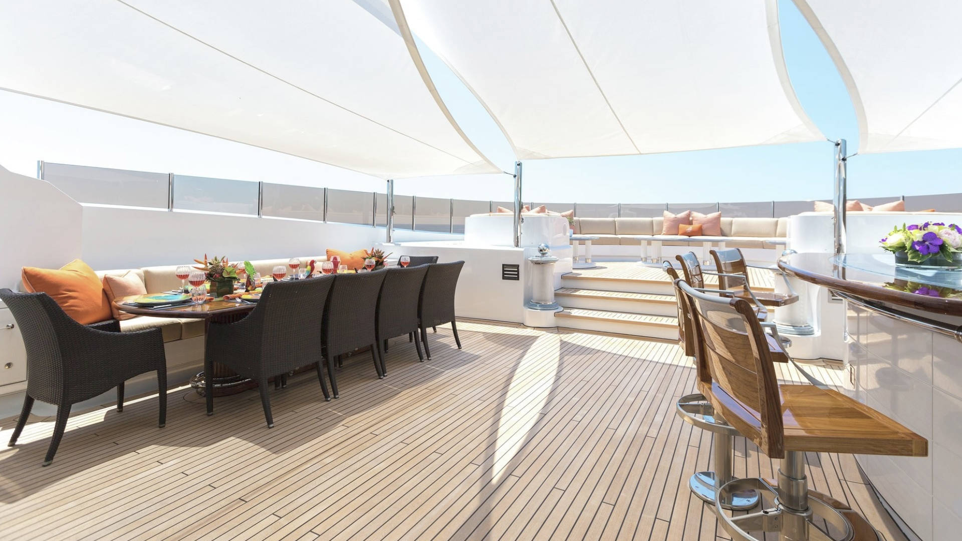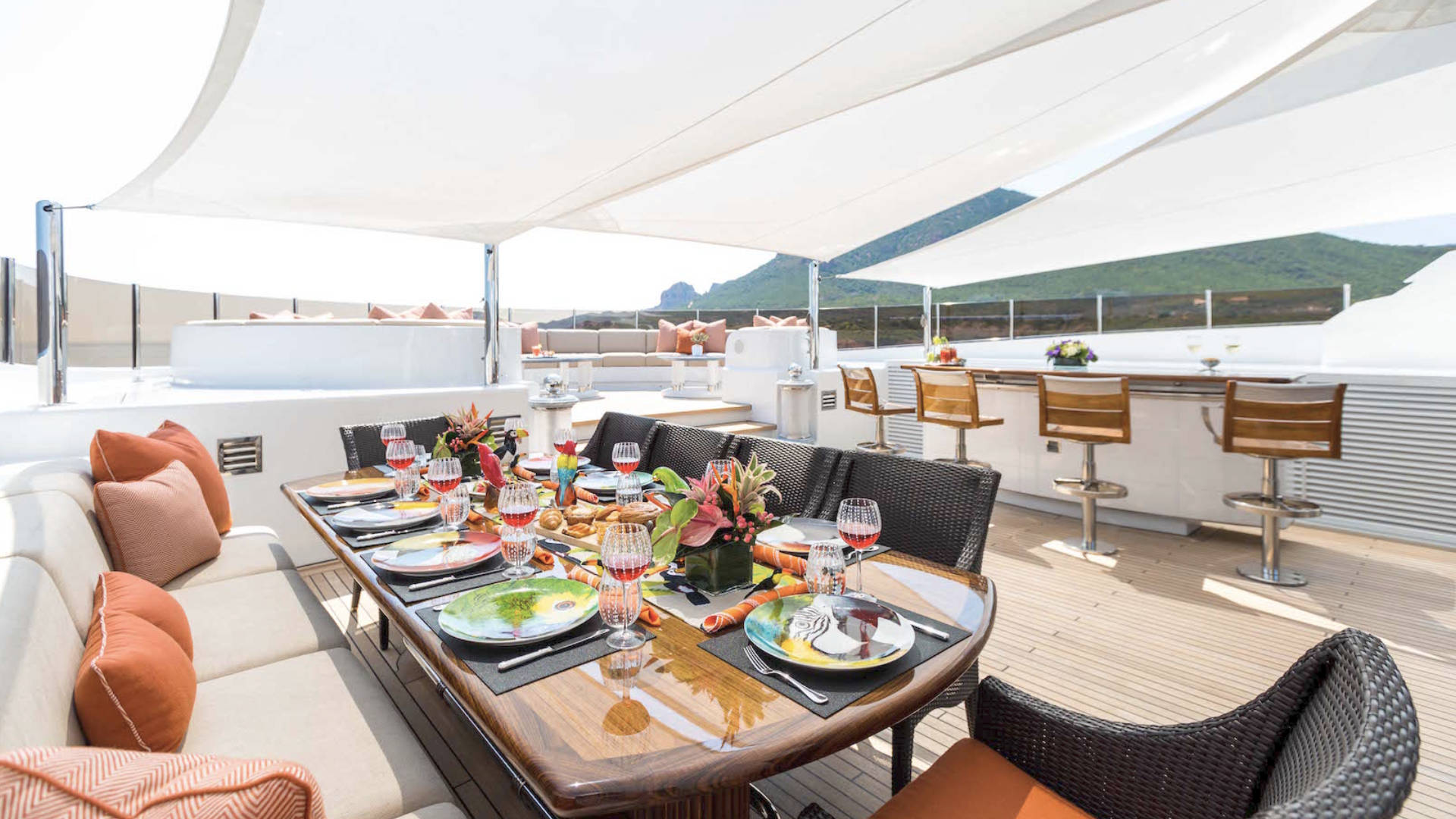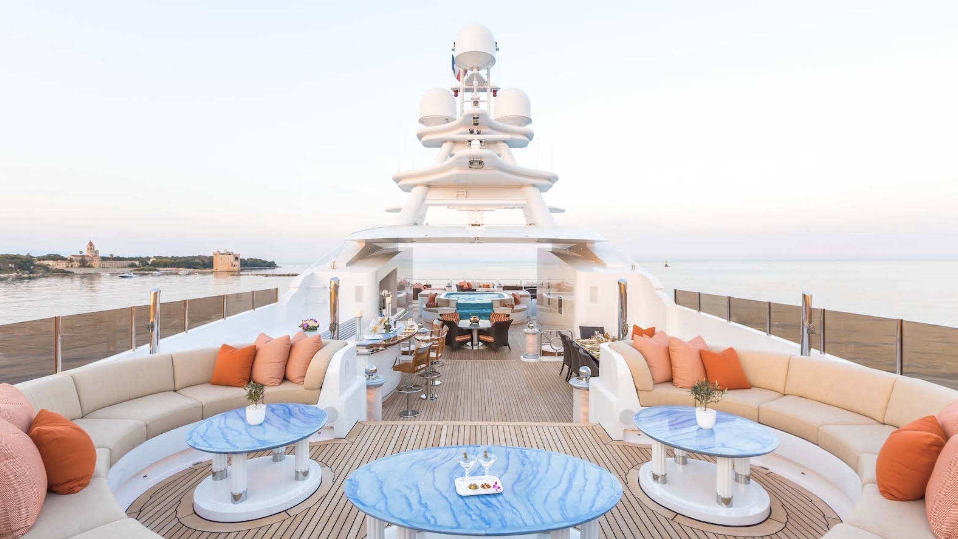The top deck with 360 degree view is a heavenly place with a plunge pool with two level waterfall, a small paddling pool ideal for children and large sun pads. An aft area can be either a seating area or a golf tee!