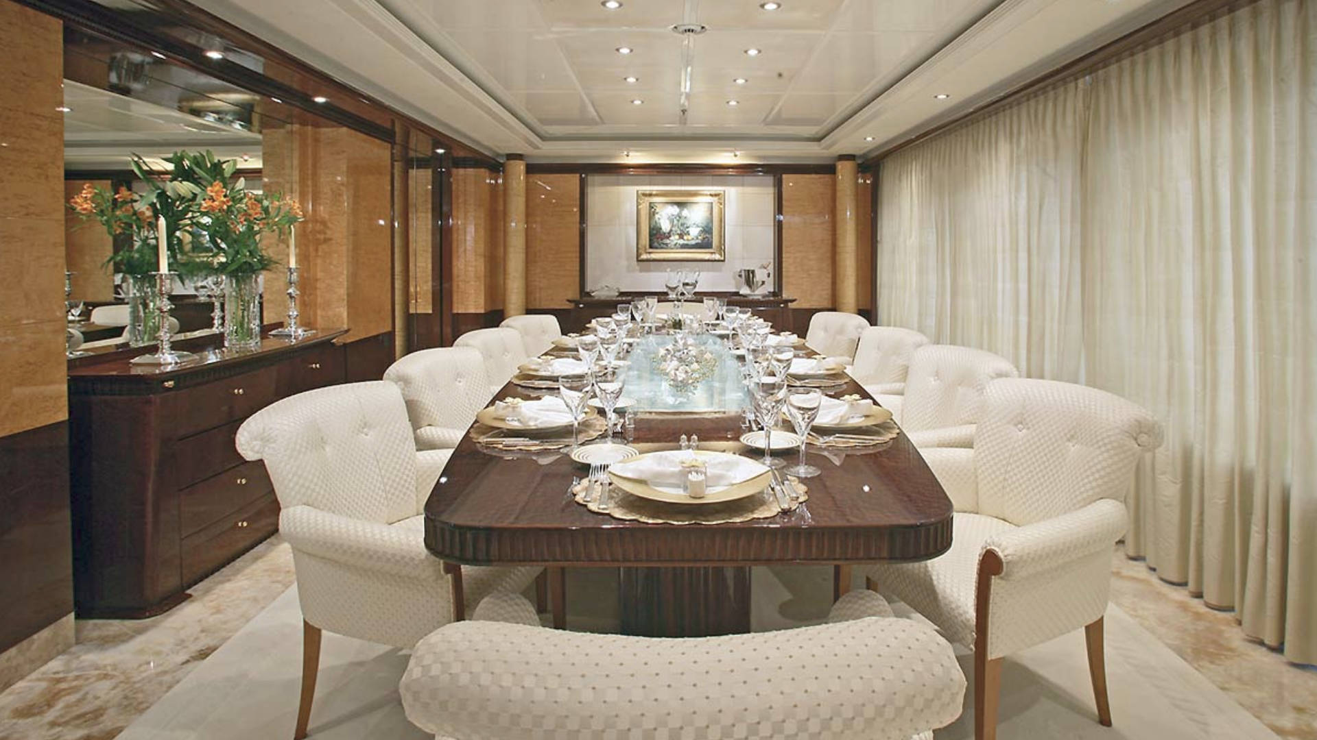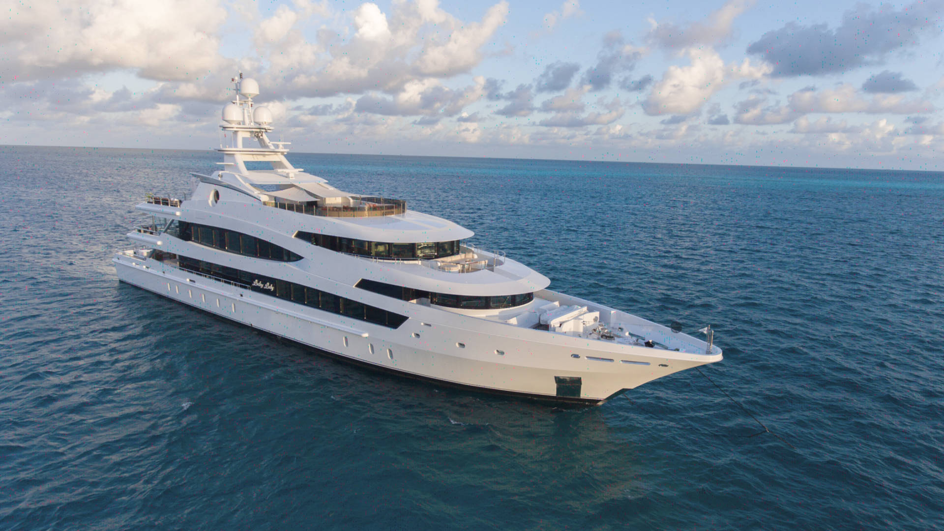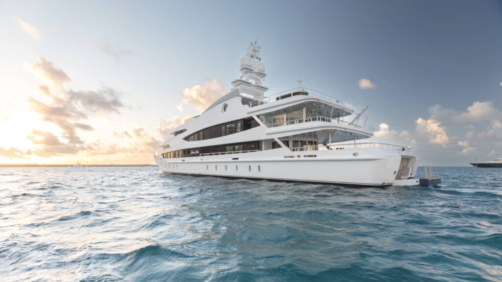 The 2022 refit included a full repaint from mast-top to keel with a new paint scheme with 2 color finish: midnight blue around windows and white side-shell. Some photos show the previous all-white exterior.