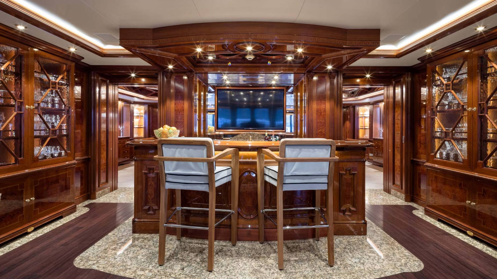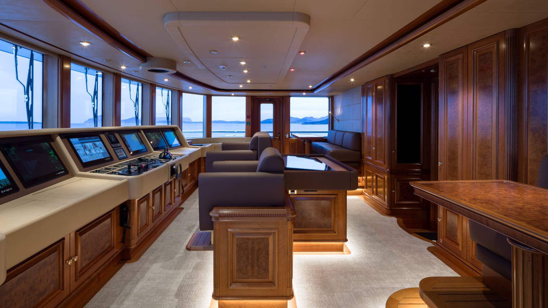 – Bridge refit including a 50” touchscreen mounted in the chart table designed for guests to interact with and discuss plans and areas of interest with the captain in real time, five new bridge monitors, new GMDSS radio package, new CCTV system including mast-mounted FLIR camera.
