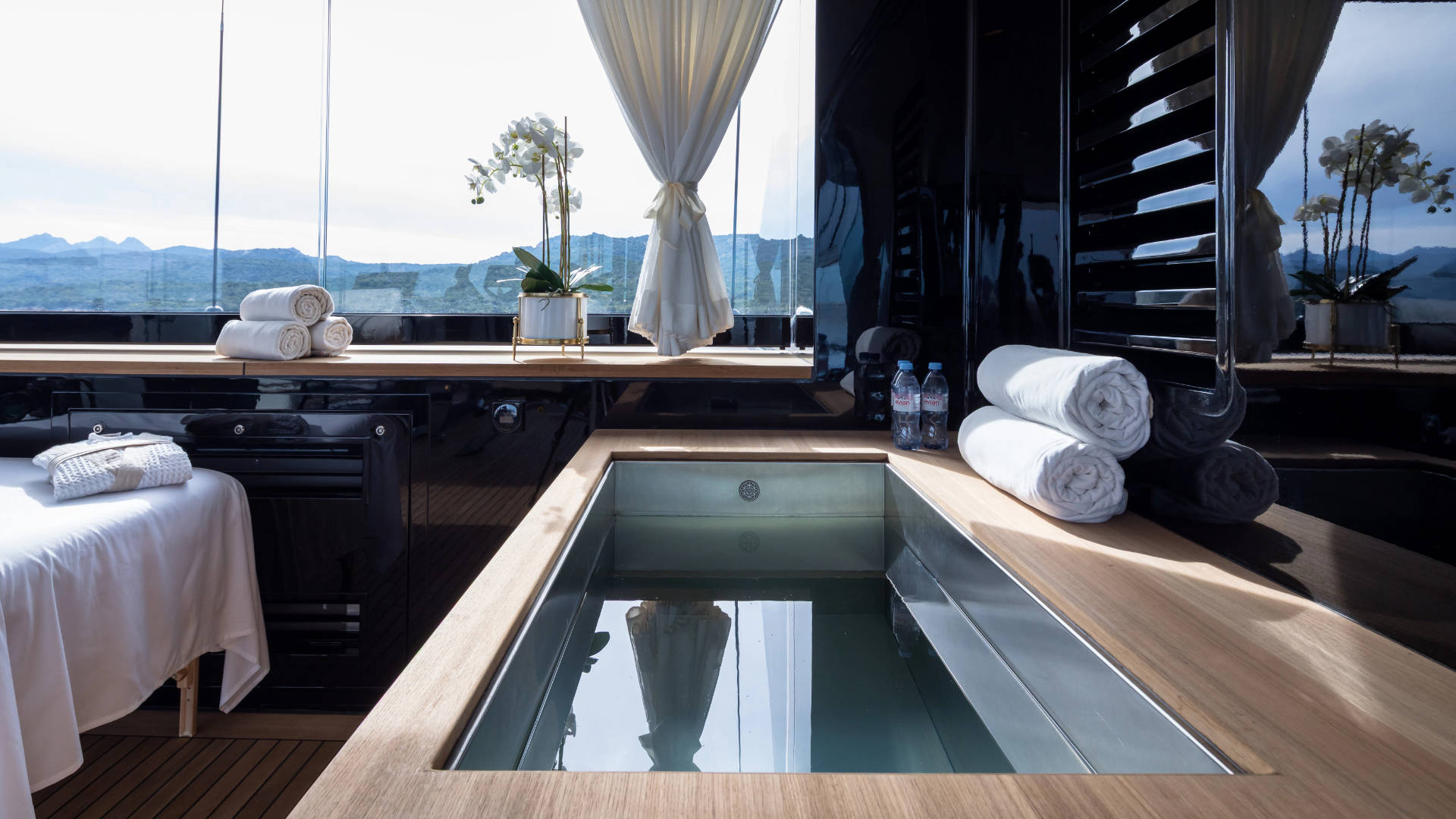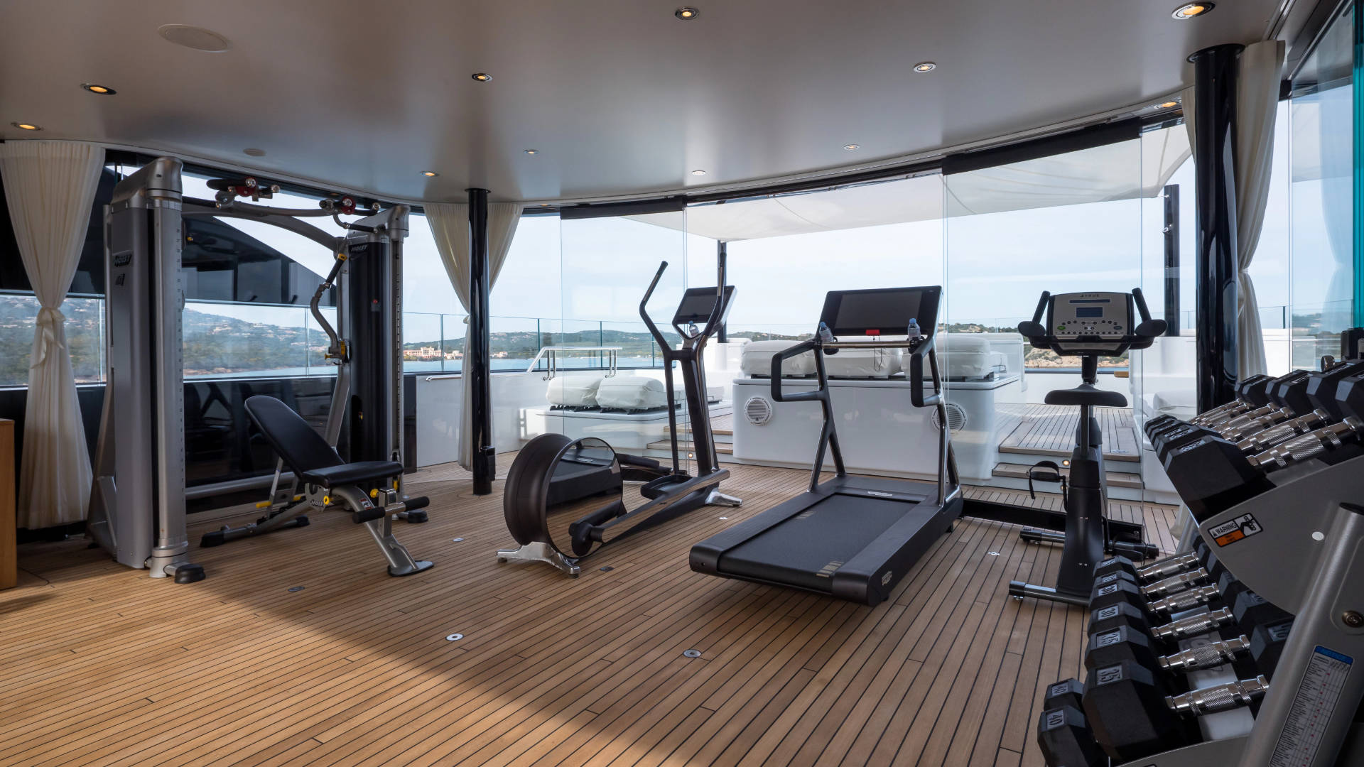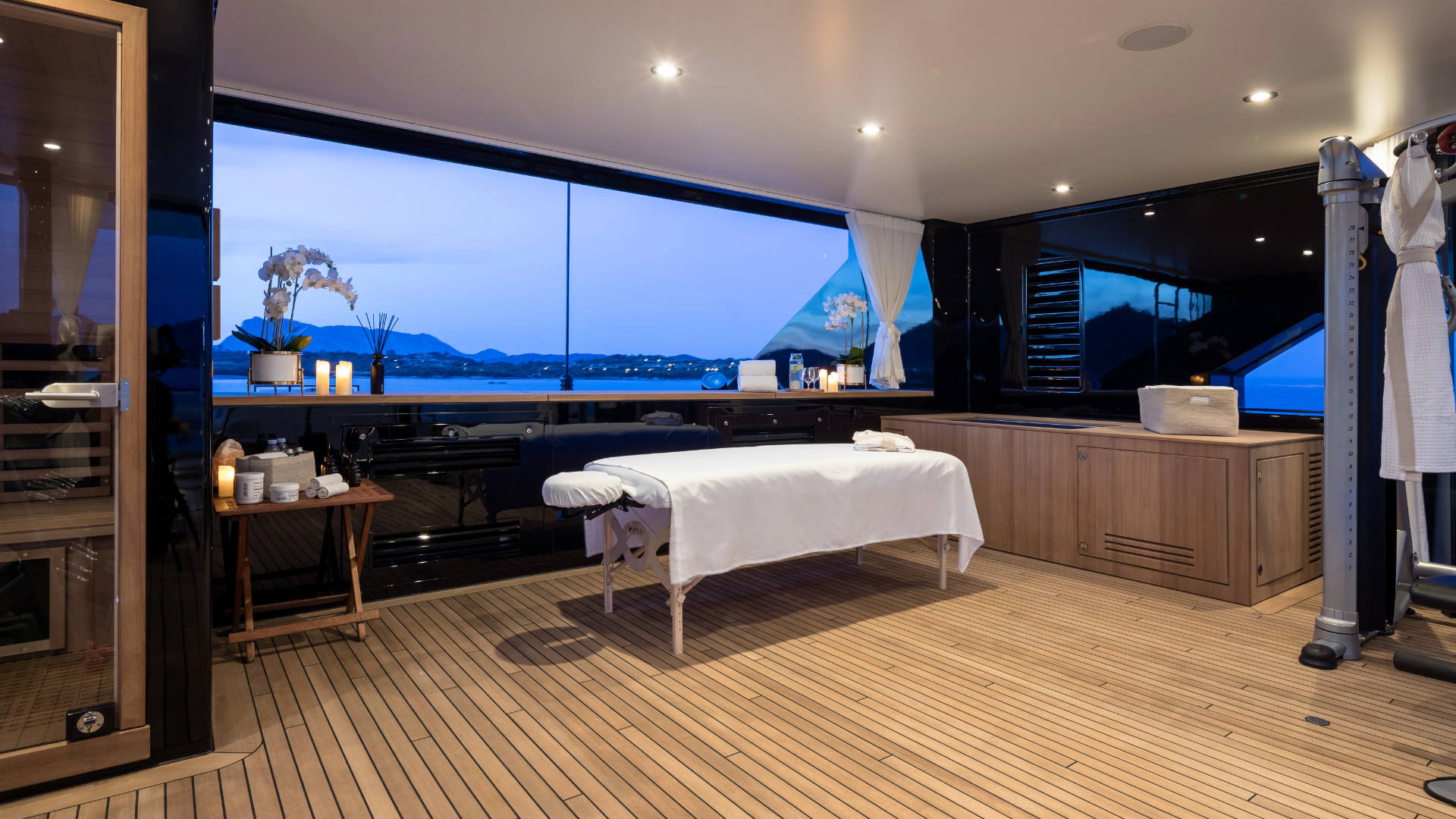 – Glass enclosed gym and spa added to the sundeck. This area can be left open or enclosed, is air-conditioned and includes a sauna, massage and cold plunge pool.