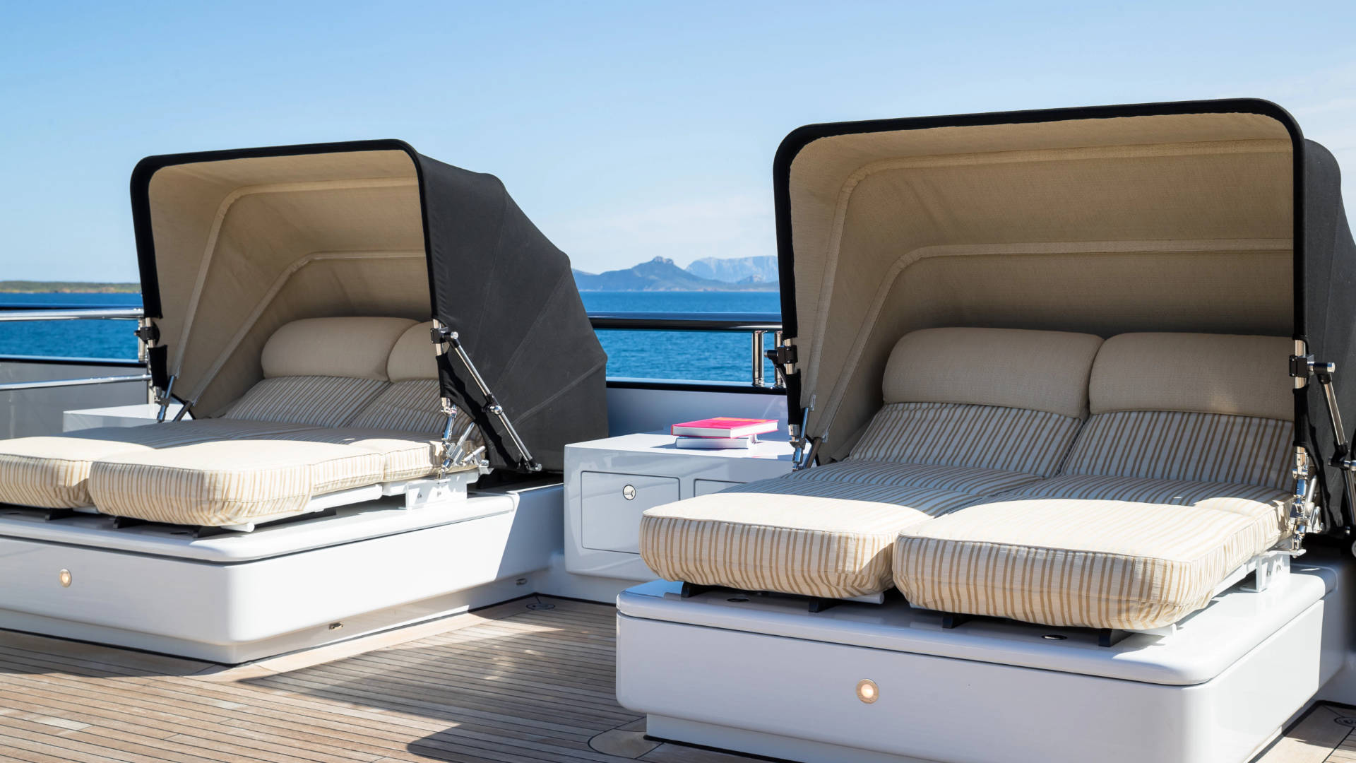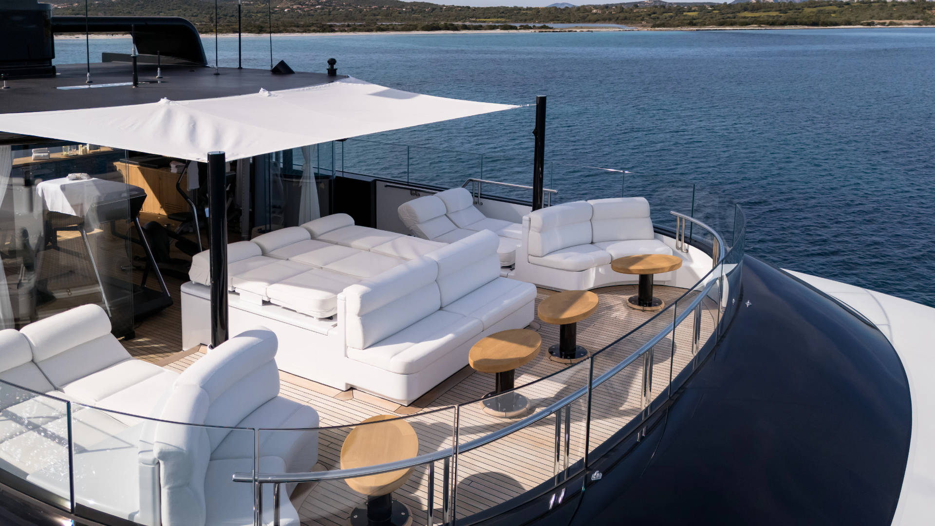 – The stern has been extended by 3m creating a new 5m/16.5 foot deep, full beam swim platform, complete with state-of-the-art awning package, a fixed swim step for ease of water access, and deck-mounted rain shower for rinsing off.